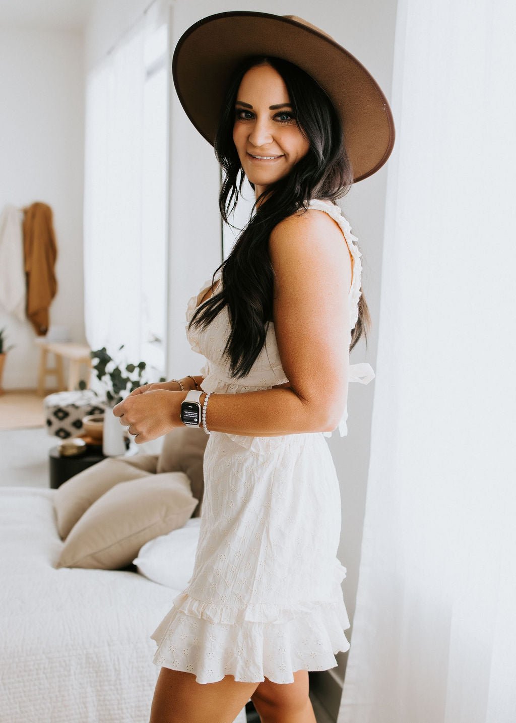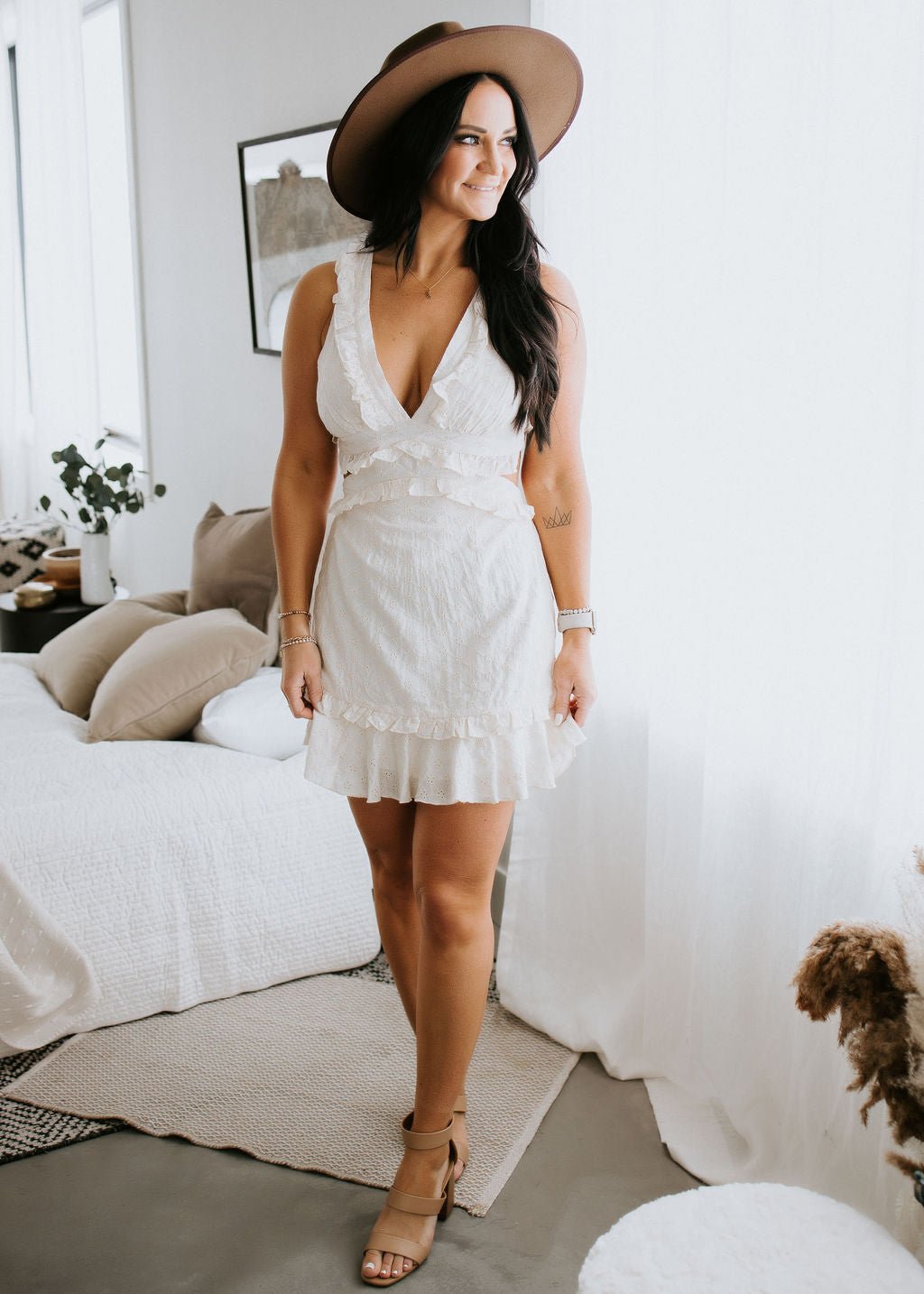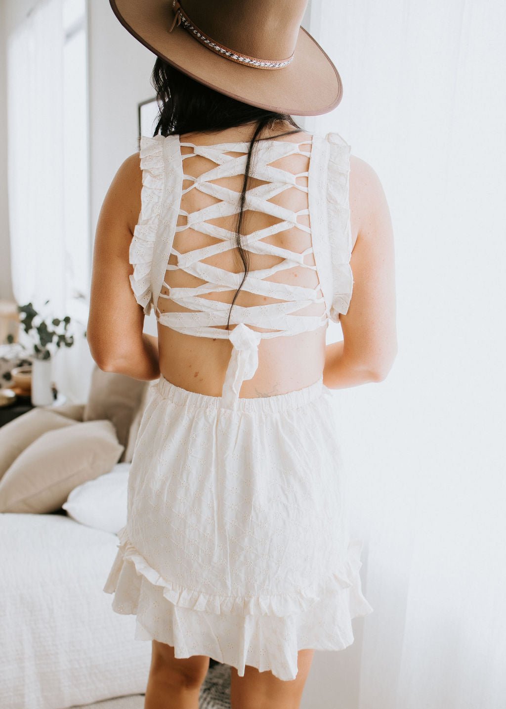 Look sweet and stay spicy this season with this adorable mini dress! Features a dainty sleeveless floral embroidery print, with an open lace-up back, and a front ruffle detailing. Lined. Laurie is wearing a size small.